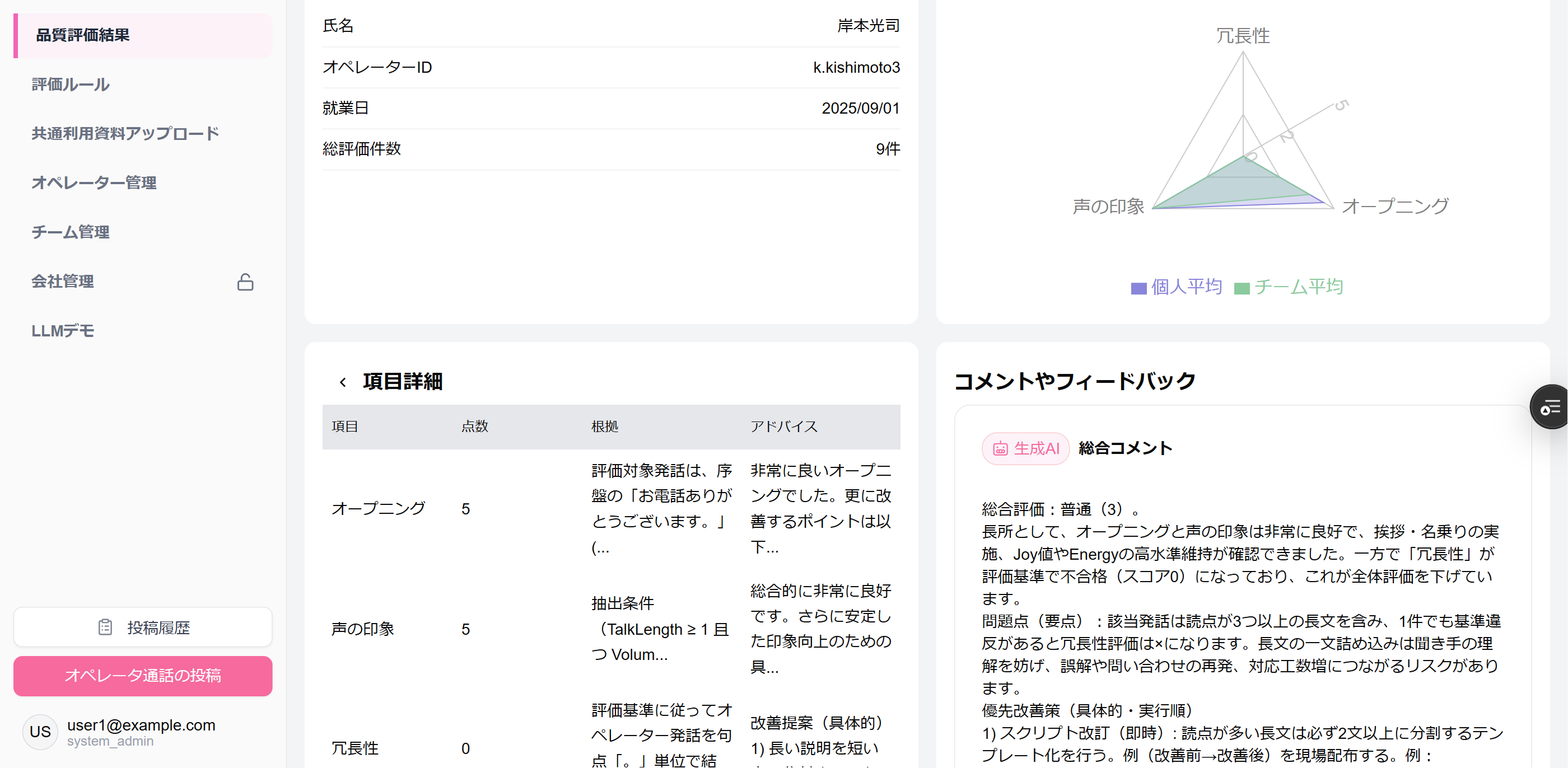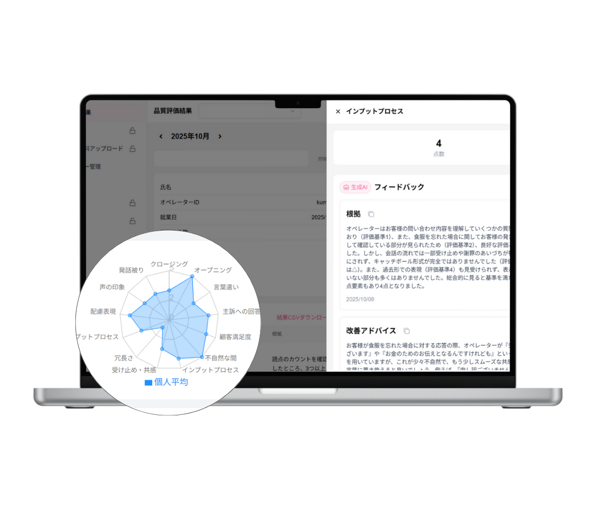 オペレーター個人やチーム全体のスコアを蓄積し、日次・月次での変化を可視化する機能です。