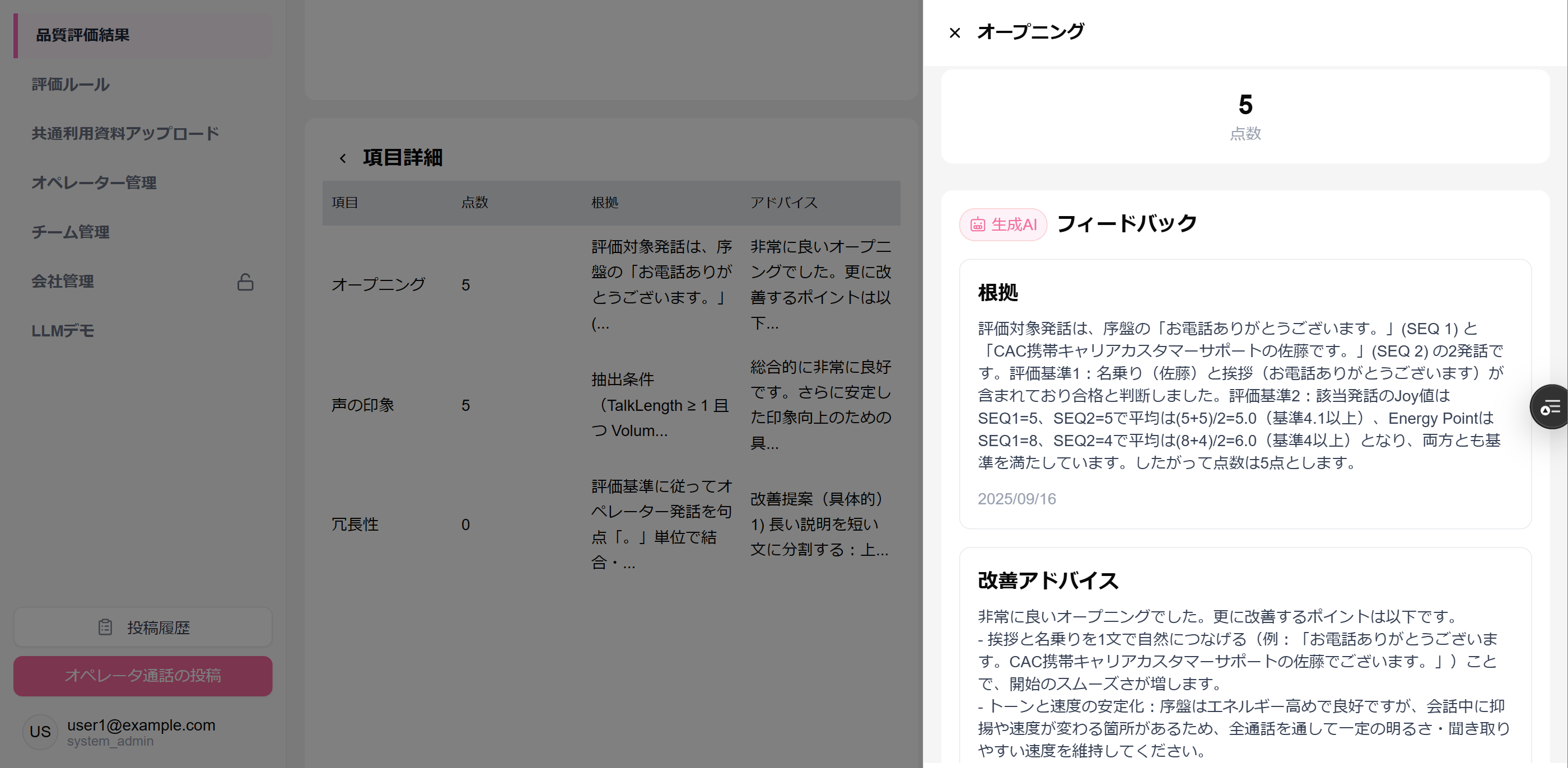 たとえば、オープニングで名乗りや挨拶ができているかの確認に加え、「明るい印象を与えているか」といったテキストだけでは判断できない要素も評価可能です。