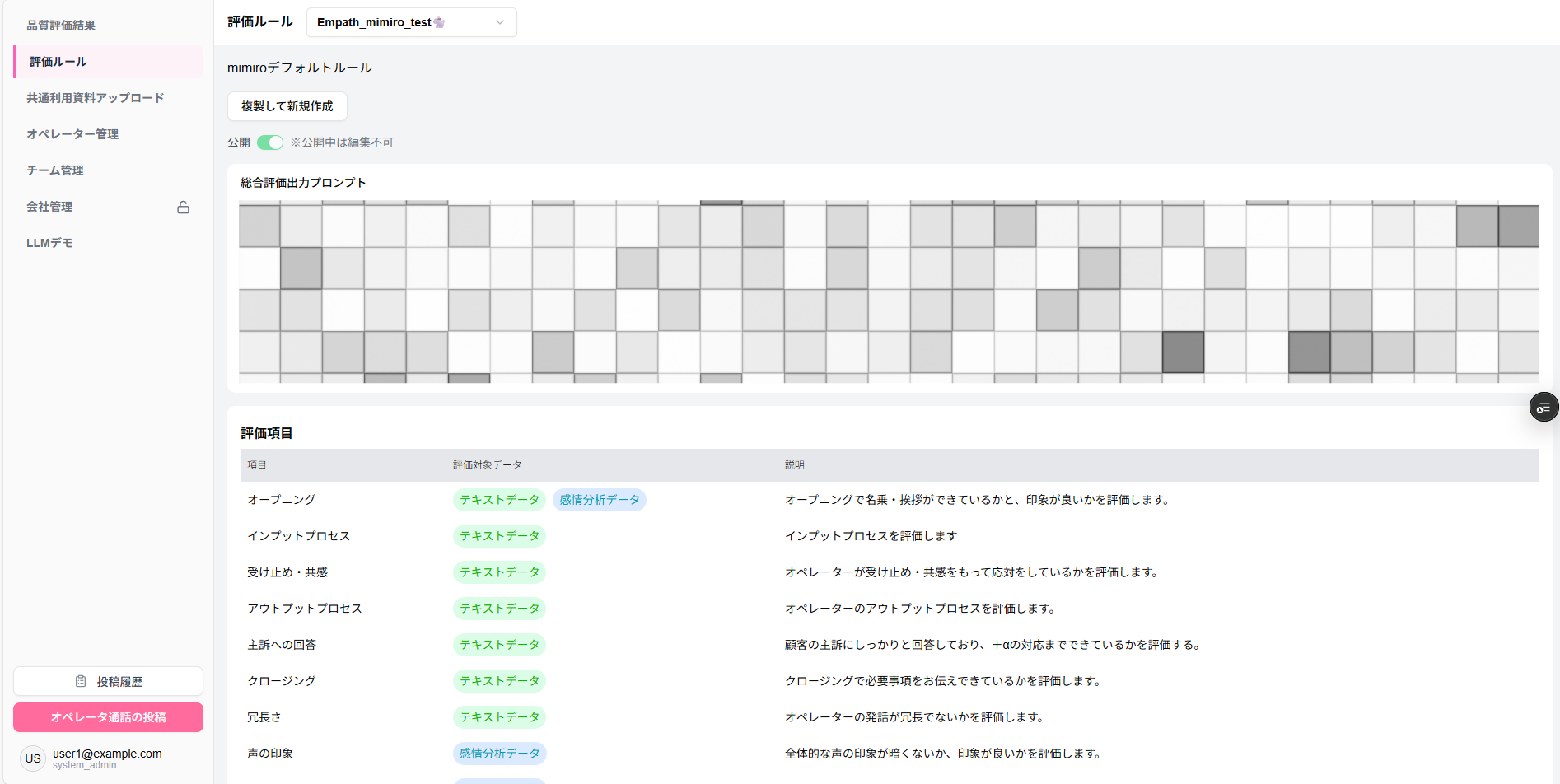 mimityは、評価ルールや基準を自社や委託先の運営方針に合わせて自由にカスタマイズすることが可能です。「オープニングの言葉遣いを重視する」「共感表現を徹底する」「商品説明のわかりやすさを重視する」など、業界や企業ごとの優先ポイントに応じて評価項目を設定可能です。これにより「評価者によって基準が異なる」という属人化を排除し、公平で一貫性のある評価を実現します。