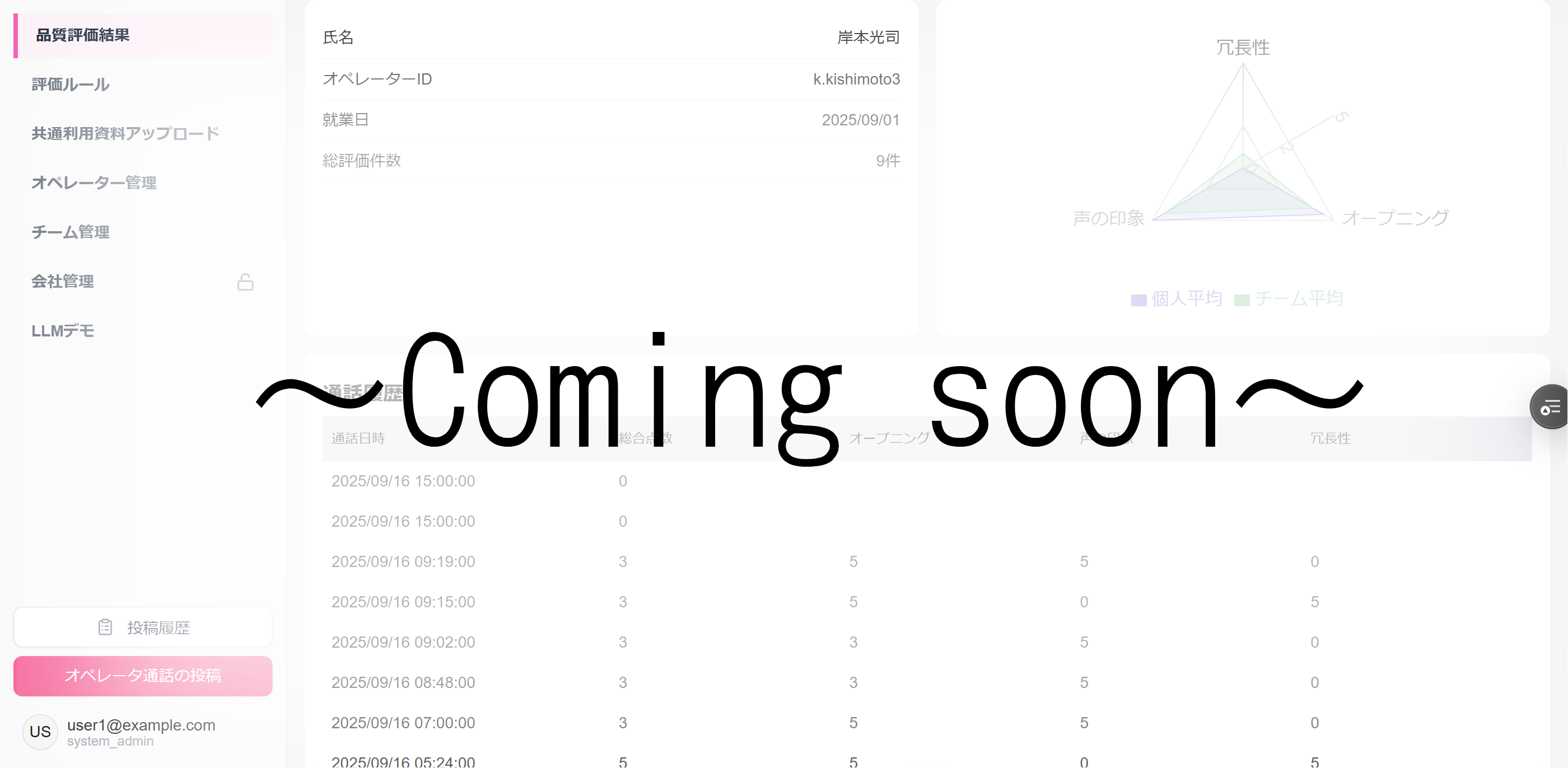 オペレーター一人ひとりへのフィードバックから、チーム全体の傾向把握までコールセンターの現場を支える応対品質評価パートナーです